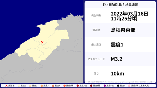 3月16日11時25分頃、島根県で最大震度1を観測する地震がありました。