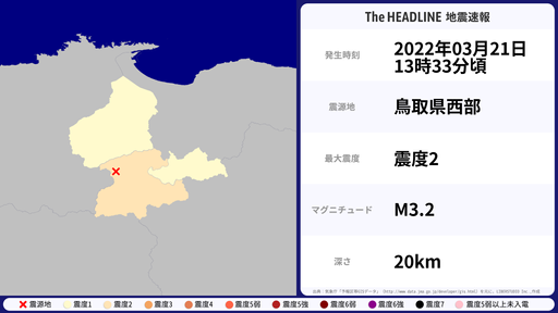 3月21日13時33分頃、鳥取県で最大震度2を観測する地震がありました。