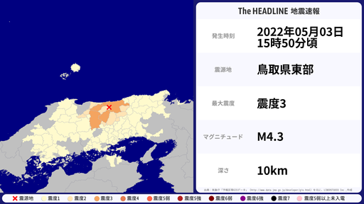 5月3日15時50分頃、鳥取県などで最大震度3を観測する地震がありました。