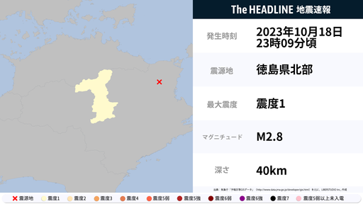 10月18日23時9分頃、徳島県で最大震度1の地震を観測