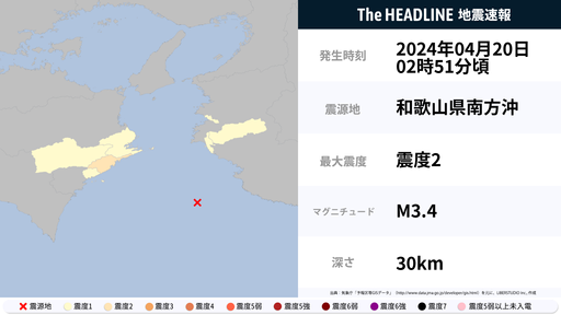 4月20日2時51分頃、徳島県で最大震度2の地震を観測
