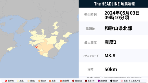 5月3日9時10分頃、和歌山県で最大震度2の地震を観測