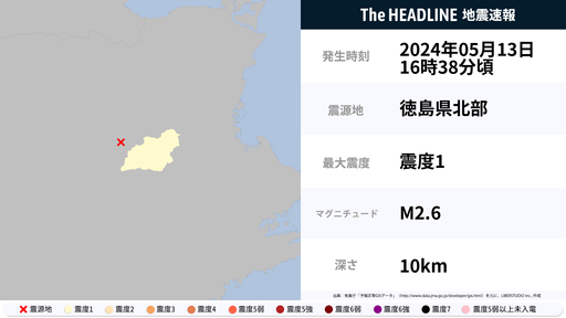 5月13日16時38分頃、徳島県で最大震度1の地震を観測