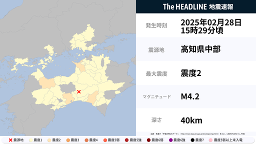 2月28日15時29分頃、香川県・愛媛県などで最大震度2の地震を観測