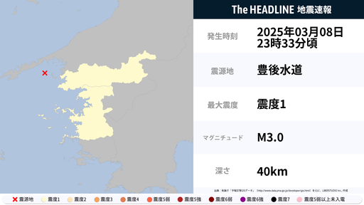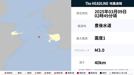 3月9日2時49分頃、愛媛県・大分県で最大震度1の地震を観測
