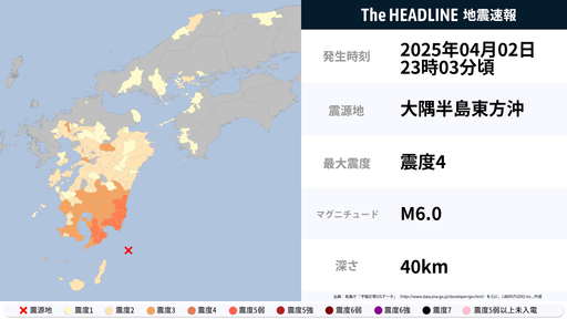 4月2日23時4分頃、宮崎県・鹿児島県で最大震度4の地震を観測