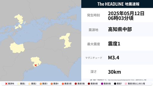 5月12日6時4分頃、広島県・徳島県などで最大震度1の地震を観測
