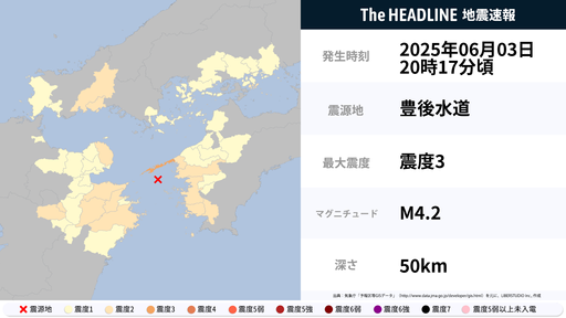 6月3日20時18分頃、愛媛県で最大震度3の地震を観測
