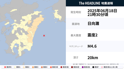 6月18日21時30分頃、大分県・宮崎県で最大震度2の地震を観測