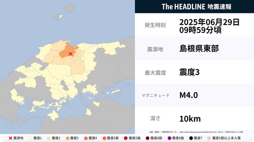 6月29日9時59分頃、鳥取県・島根県で最大震度3の地震を観測