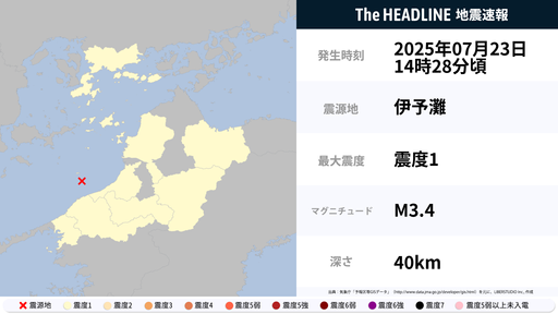7月23日14時29分頃、広島県・愛媛県で最大震度1の地震を観測