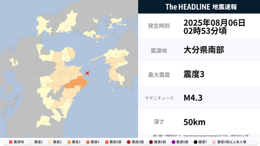 8月6日2時53分頃、大分県で最大震度3の地震を観測