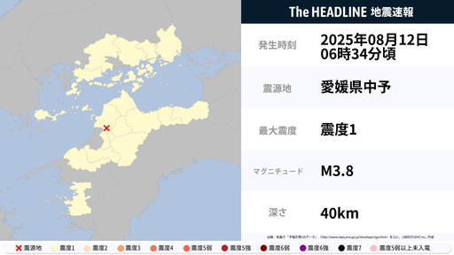 8月12日6時34分頃、広島県・山口県などで最大震度1の地震を観測