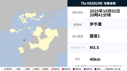 10月02日20時41分頃、伊予灘を震源とするマグニチュード3.5の地震が観測された。最大震度1を観測したのは、広島県・山口県など。