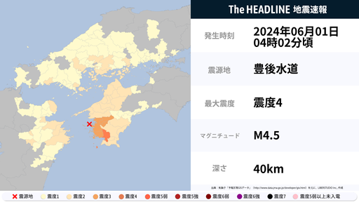 6月1日4時2分頃、高知県で最大震度4の地震を観測