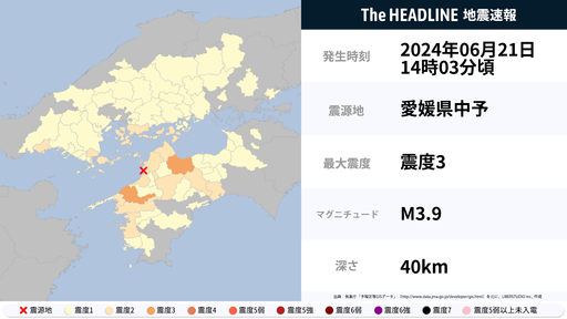 6月21日14時4分頃、愛媛県で最大震度3の地震を観測
