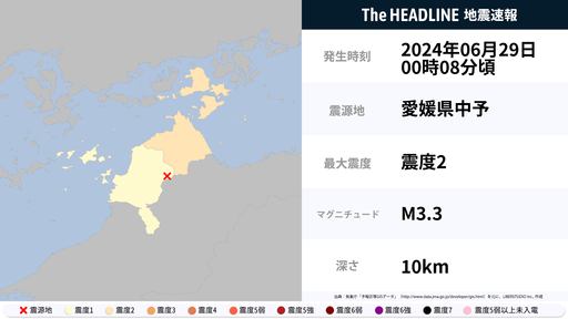 6月29日0時8分頃、愛媛県で最大震度2の地震を観測