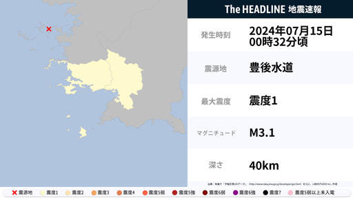 7月15日0時32分頃、愛媛県・高知県で最大震度1の地震を観測