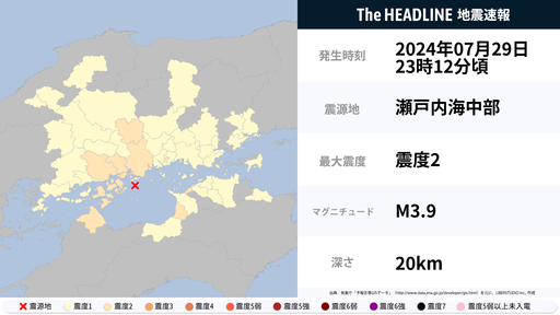 7月29日23時12分頃、岡山県・広島県などで最大震度2の地震を観測