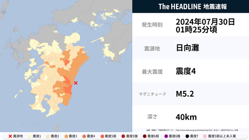 7月30日1時25分頃、宮崎県で最大震度4の地震を観測