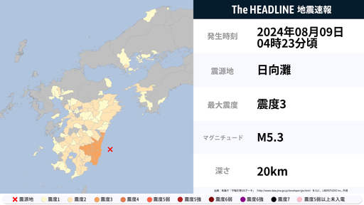 8月9日4時23分頃、宮崎県で最大震度3の地震を観測