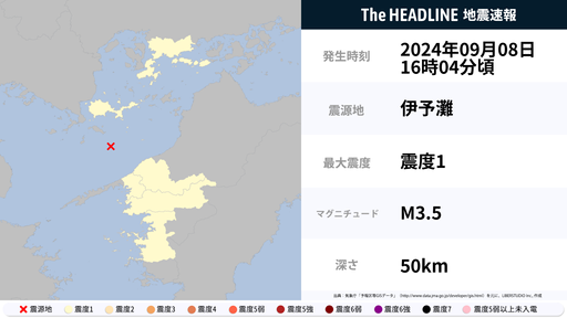 9月17日10時58分頃、愛媛県で最大震度1の地震を観測