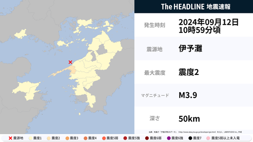 9月12日10時59分頃、愛媛県で最大震度2の地震を観測