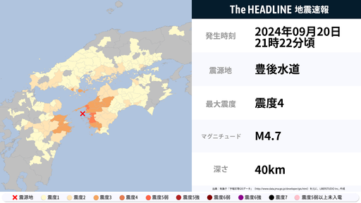9月20日21時22分頃、愛媛県で最大震度4の地震を観測
