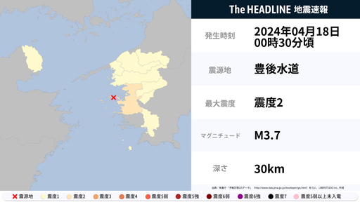 4月18日0時37分頃、愛媛県・高知県で最大震度2の地震を観測