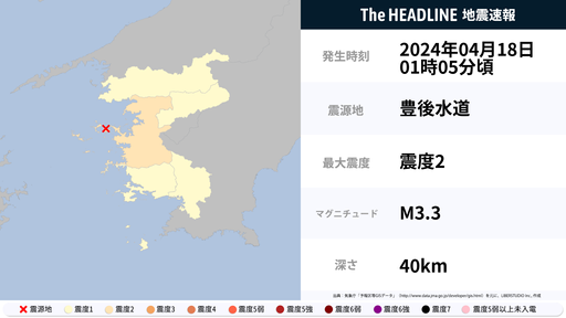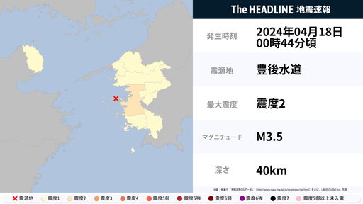 4月18日0時44分頃、愛媛県で最大震度2の地震を観測