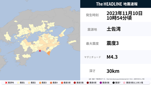 11月10日10時54分頃、高知県で最大震度3の地震を観測