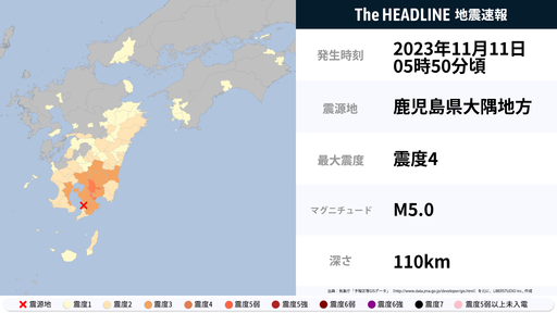 11月11日5時50分頃、鹿児島県で最大震度4の地震を観測