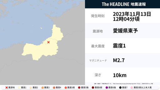 11月13日12時4分頃、香川県・愛媛県で最大震度1の地震を観測