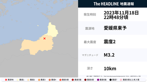 11月18日22時48分頃、愛媛県で最大震度2の地震を観測