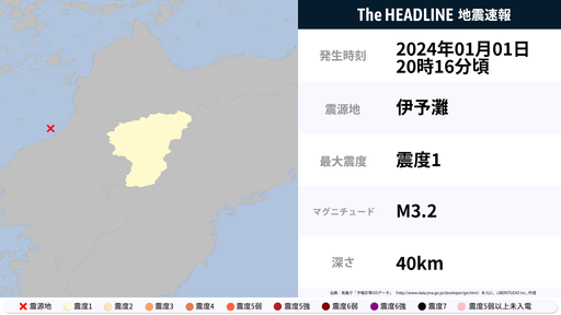 1月1日20時16分頃、愛媛県で最大震度1の地震を観測
