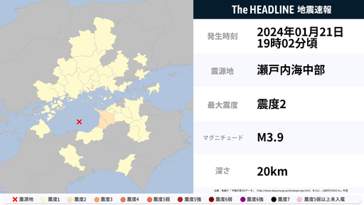 1月21日19時2分頃、岡山県・香川県などで最大震度2の地震を観測