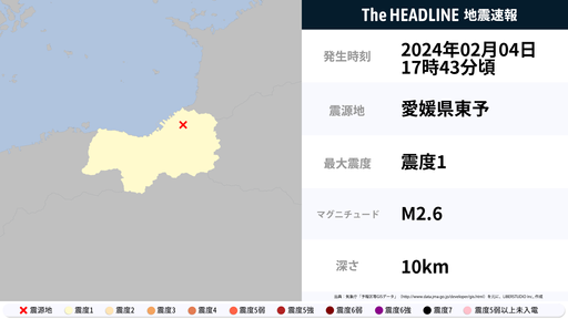2月4日17時43分頃、愛媛県で最大震度1の地震を観測