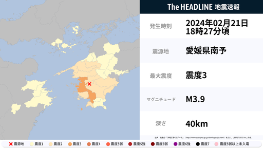 2月21日18時27分頃、愛媛県・高知県で最大震度3の地震を観測
