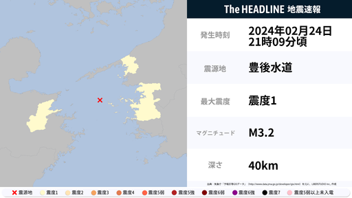 2月24日21時9分頃、愛媛県・大分県で最大震度1の地震を観測