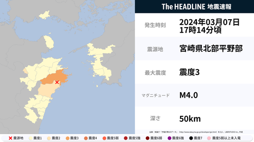 3月2日23時0分頃、宮崎県で最大震度4の地震を観測