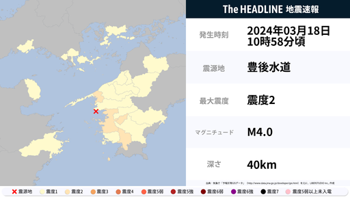 3月18日10時58分頃、愛媛県・高知県で最大震度2の地震を観測