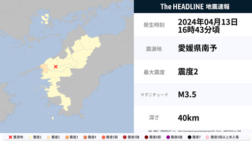 4月13日16時43分頃、愛媛県で最大震度2の地震を観測
