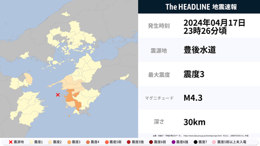 4月17日23時27分頃、愛媛県・高知県で最大震度3の地震を観測