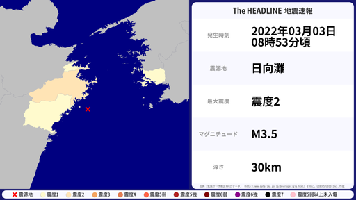 3月3日08時54分頃、大分県で最大震度2を観測する地震がありました。