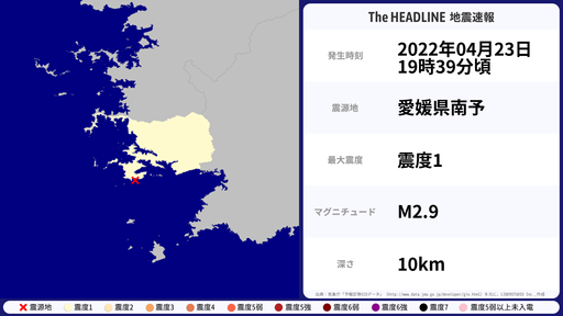 4月23日19時39分頃、愛媛県で最大震度1を観測する地震がありました。