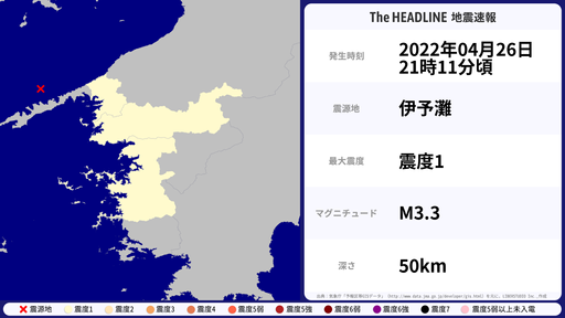 4月26日21時12分頃、愛媛県で最大震度1を観測する地震がありました。