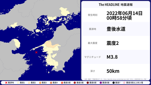 6月14日00時58分頃、愛媛県で最大震度2を観測する地震がありました。