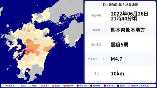 6月26日21時44分頃、熊本県で最大震度5弱を観測する地震がありました。