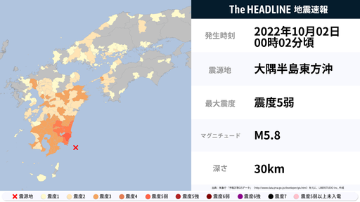 10月2日0時2分頃、宮崎県で最大震度5弱の地震を観測