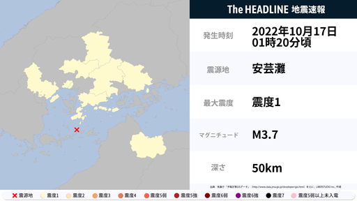 10月17日1時20分頃、広島県・愛媛県で最大震度1の地震を観測